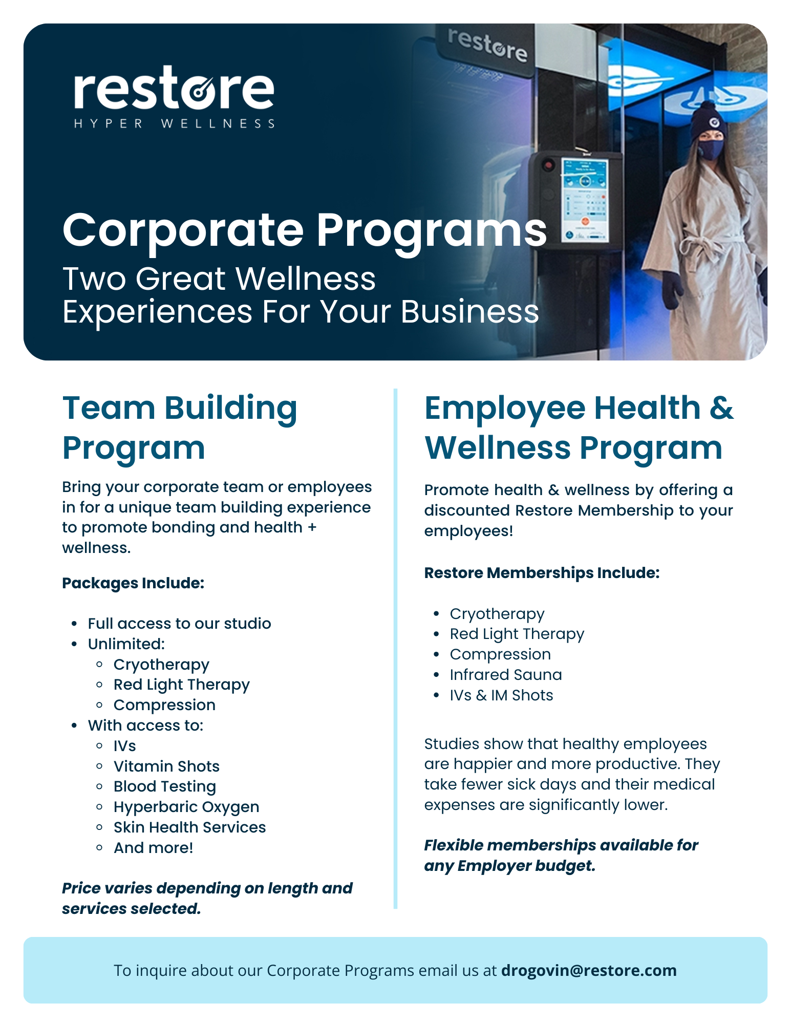 At Restore Hyper Wellness, we’re excited to offer our Corporate Wellness Partners a suite of special benefits crafted to support your associates’ well-being. Our partners enjoy exclusive perks and tailored wellness solutions ensuring your team has the best possible support on their journey to better health.